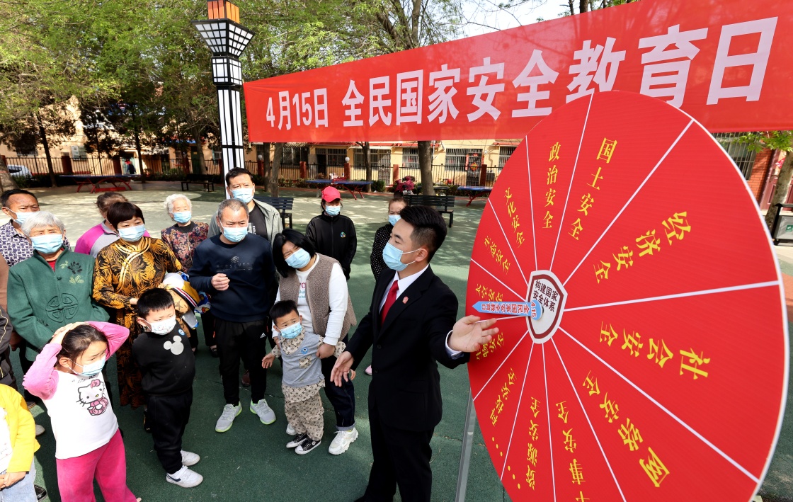 山東省棗莊市市中區(qū)人民法院工作人員在龍山路街道榮華里社區(qū)向居民講解國(guó)家安全知識(shí)(2022年4月14日攝)。新華社發(fā)(孫中喆 攝)