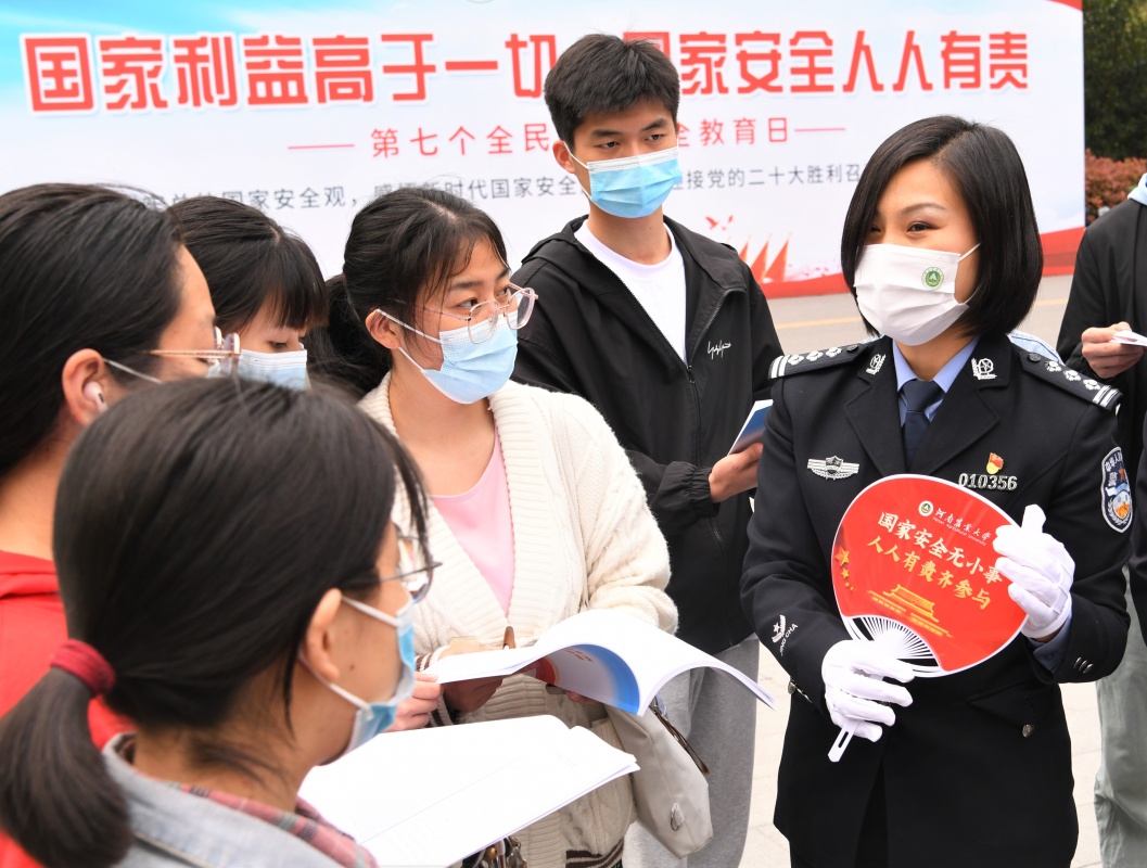 在河南農(nóng)業(yè)大學(xué)開(kāi)展“全民國(guó)家安全教育進(jìn)校園”宣傳教育活動(dòng)中,鄭州市公安局民警與學(xué)生們互動(dòng)(2022年4月15日攝)。新華社發(fā)(劉書(shū)亭 攝)