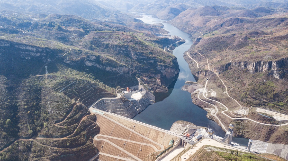 這是在位于烏蒙山區(qū)的貴州省納雍縣六沖河畔拍攝的夾巖水利樞紐工程(2022年3月17日攝,無(wú)人機(jī)照片)。新華社記者 陶亮 攝