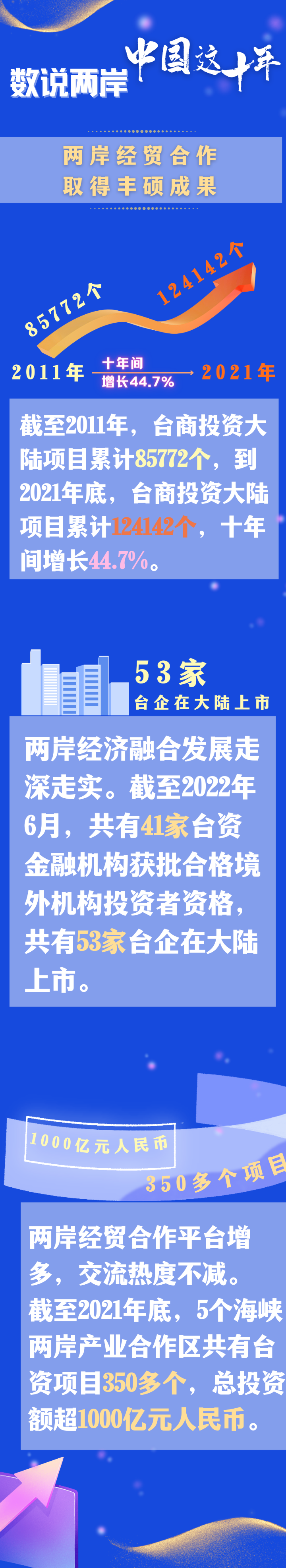十年來(lái),兩岸貿(mào)易和臺(tái)商對(duì)大陸投資顯著增長(zhǎng)。2011年兩岸貿(mào)易額為1600.3億美元,2021年增至3283.4億美元。截至2011年,臺(tái)商投資大陸項(xiàng)目累計(jì)85772個(gè),到2021年底累計(jì)達(dá)到124142個(gè),十年間增長(zhǎng)44.7%。大陸穩(wěn)居臺(tái)灣地區(qū)最大出口市場(chǎng)、最大貿(mào)易順差來(lái)源地、臺(tái)商島外投資第一大目的地。
