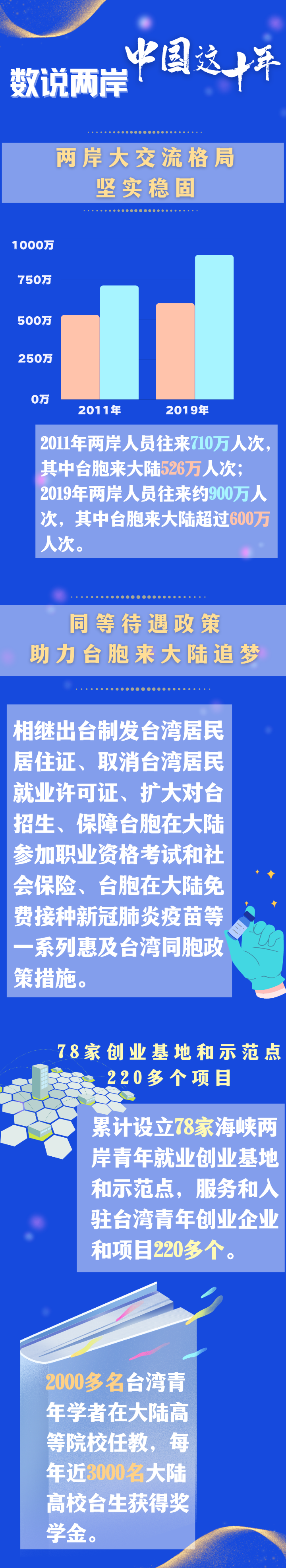 2018年以來(lái),大陸方面先后出臺(tái)促進(jìn)兩岸經(jīng)濟(jì)文化交流合作的“31條措施”“26條措施”,助力臺(tái)胞臺(tái)企發(fā)展的“11條措施”“農(nóng)林22條措施”,以及擴(kuò)大開(kāi)放臺(tái)灣居民在大陸申設(shè)個(gè)體工商戶的政策,助力臺(tái)胞臺(tái)企分享更多大陸發(fā)展機(jī)遇、享受更多同等待遇。