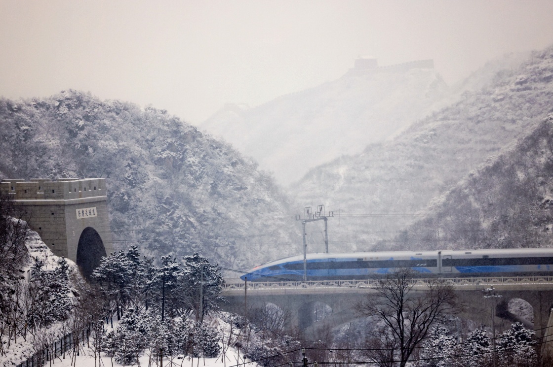 2022年1月21日,G8825次冬奧列車經(jīng)過居庸關(guān)隧道,冒雪駛向太子城,開啟賽時運輸服務(wù)。新華社記者 邢廣利 攝