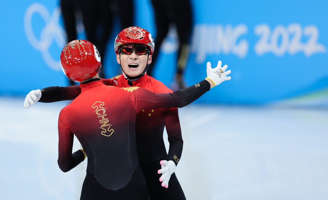 2022年2月5日,中國選手任子威(右)與隊友武大靖在北京2022年冬奧會短道速滑項目混合團(tuán)體接力決賽后慶祝奪冠。新華社記者 蘭紅光 攝