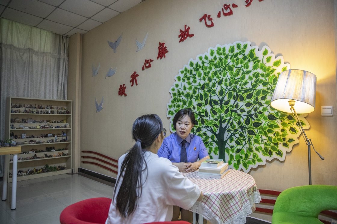 9月20日,在重慶市大渡口區(qū)人民檢察院“莎姐”談心室內(nèi),梅玫與一名前來咨詢的未成年人談心。新華社記者 黃偉 攝