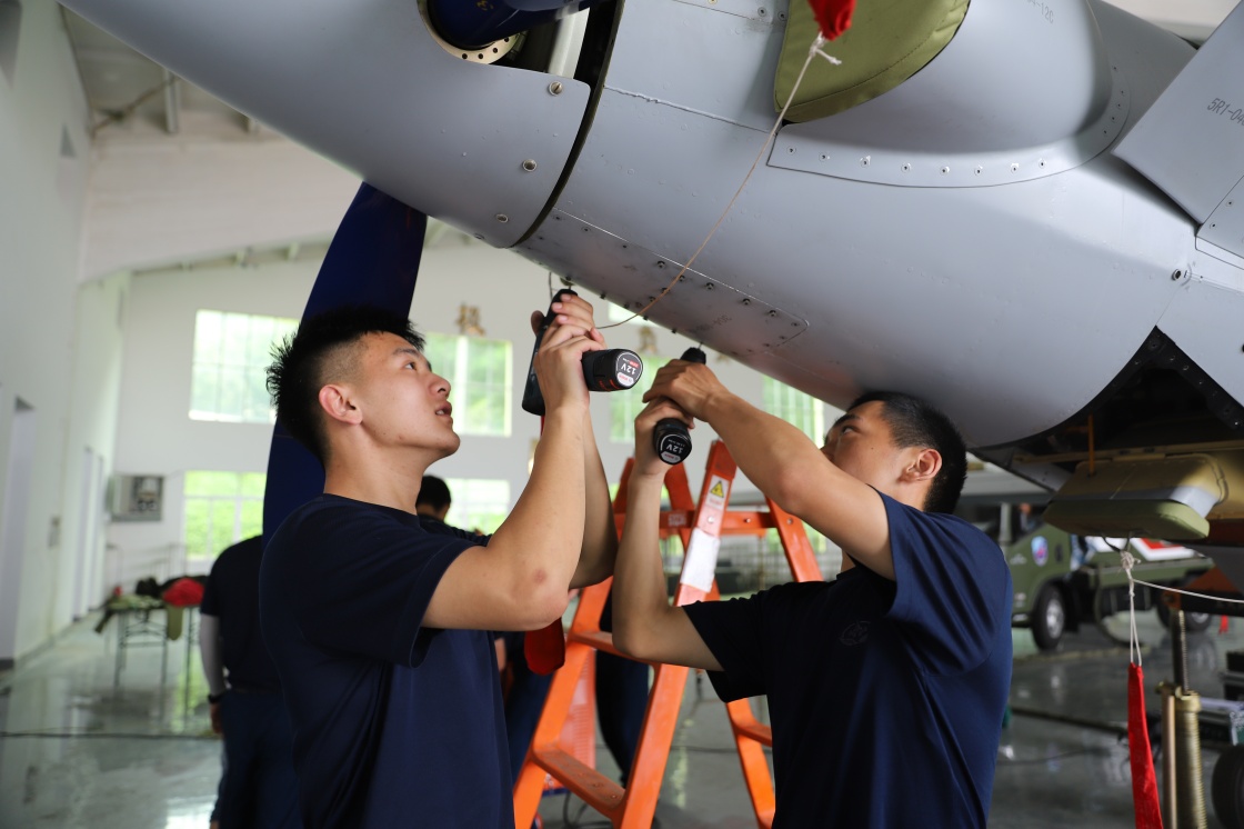空軍航空兵某團(tuán)機(jī)務(wù)人員對無人機(jī)進(jìn)行維護(hù)(2022年7月29日攝)。新華社發(fā)(孫晟軒 攝)