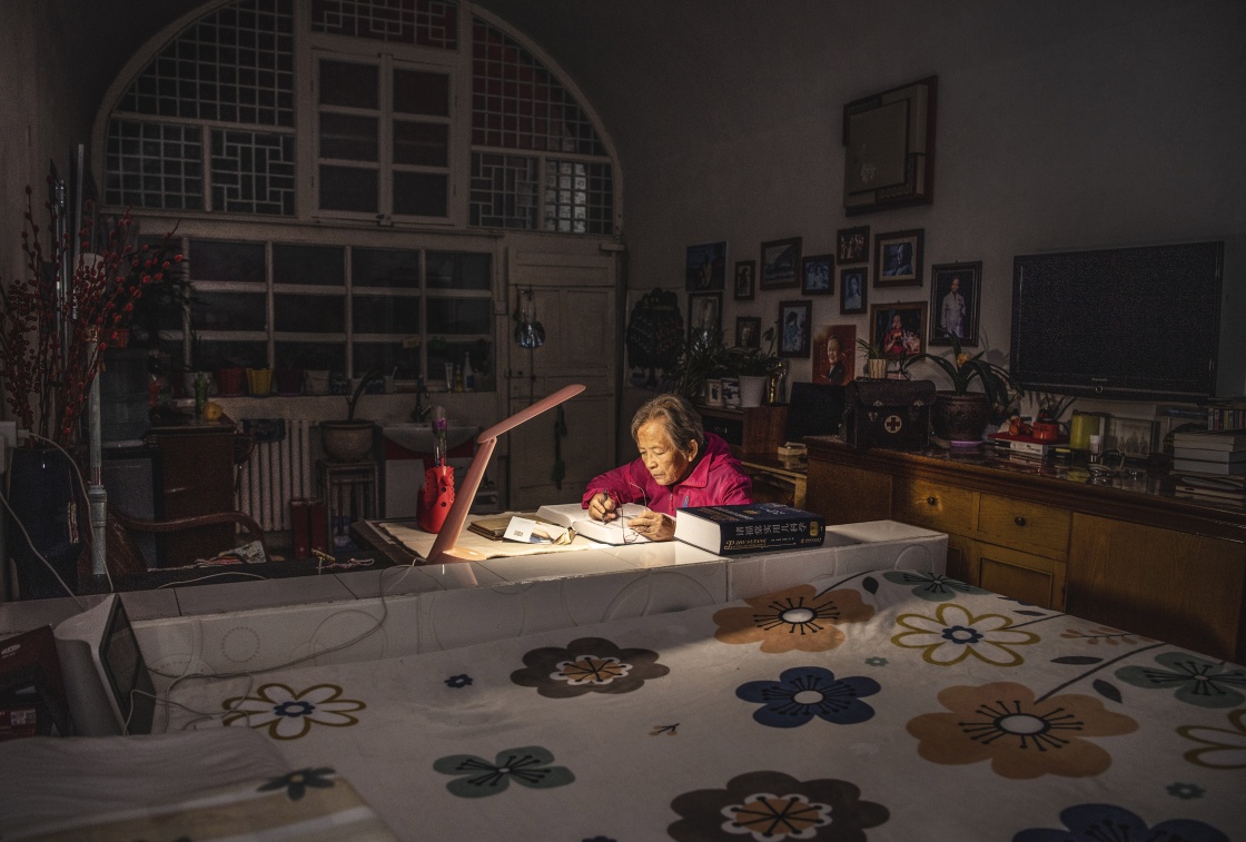 路生梅在窯洞里挑燈學(xué)習(xí)(2022年9月16日攝)。新華社記者 陶明 攝