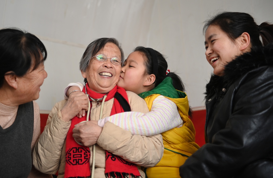 路生梅(左二)在陜西佳縣佳州街道凌云社區(qū)義診時(shí),張宇旋親密擁抱她(2021年1月17日攝)。張宇旋的媽媽?zhuān)ㄓ乙唬?、奶奶(左一)都曾讓路生梅看過(guò)病。新華社記者 陶明 攝
