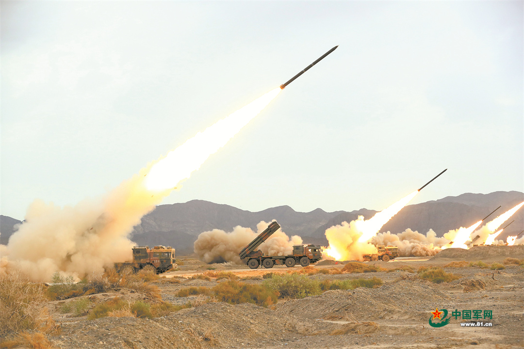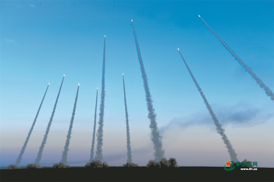 陣地上空,長(zhǎng)風(fēng)呼嘯,火箭彈拖著尾焰噴射而出,在空中形成密集火網(wǎng)。