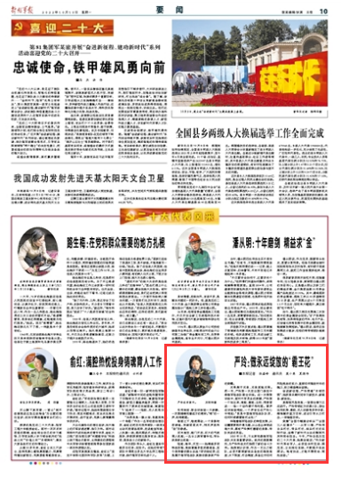 榮膺“全國巾幗建功標兵”“全國三八紅旗手”……從軍11載,嚴玲用當兵打仗、帶兵打仗、練兵打仗的實際行動,詮釋了新時代女兵的靚麗風采和使命擔當。今年,嚴玲當選為黨的二十大代表,她激動地說:“作為新時代革命軍人,必須堅決聽黨話、跟黨走,立足崗位實踐,不斷提升實戰(zhàn)硬功。唯有如此,才能不辱使命、制勝戰(zhàn)場。”