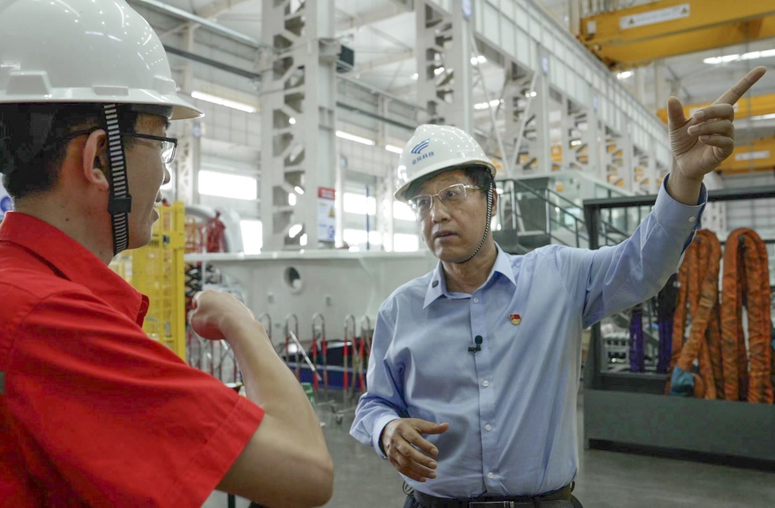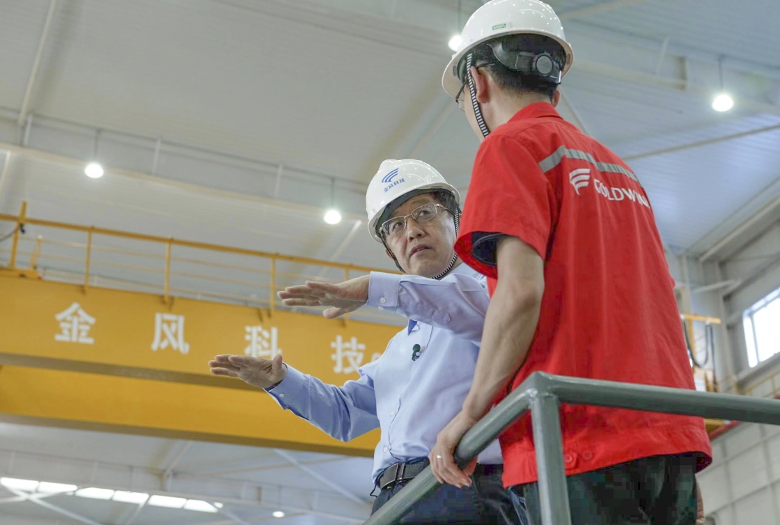 在金風(fēng)科技新疆達(dá)坂城風(fēng)電裝備產(chǎn)業(yè)基地零碳智能工廠內(nèi),武鋼(右)與技術(shù)工程師在一起交流(2022年8月6日攝)。新華社發(fā)