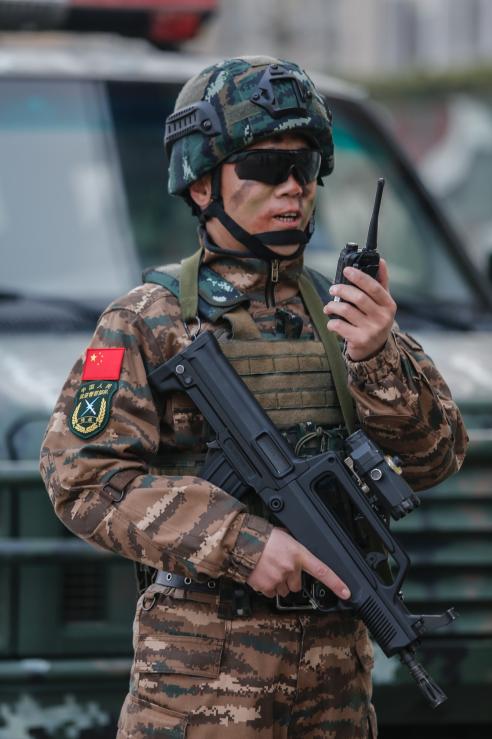 武警河北總隊(duì)某部大隊(duì)長(zhǎng)李闖在演練中下達(dá)任務(wù)指令(2021年3月4日攝)。新華社發(fā)(張丹 攝)