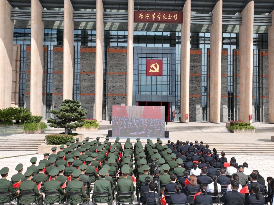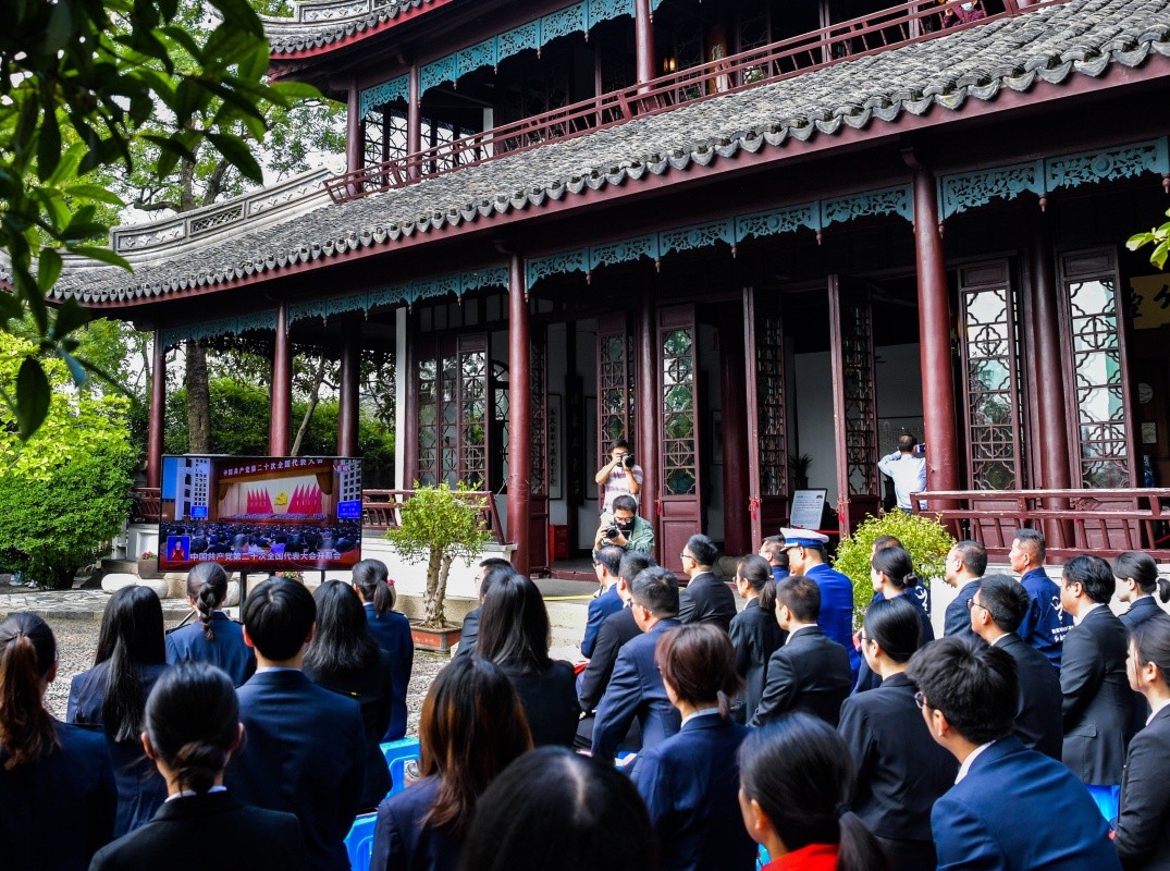 10月16日,武警浙江總隊(duì)嘉興支隊(duì)官兵在南湖革命紀(jì)念館前與工作人員一起收看中國(guó)共產(chǎn)黨第二十次全國(guó)代表大會(huì)開幕會(huì)(無人機(jī)照片)。