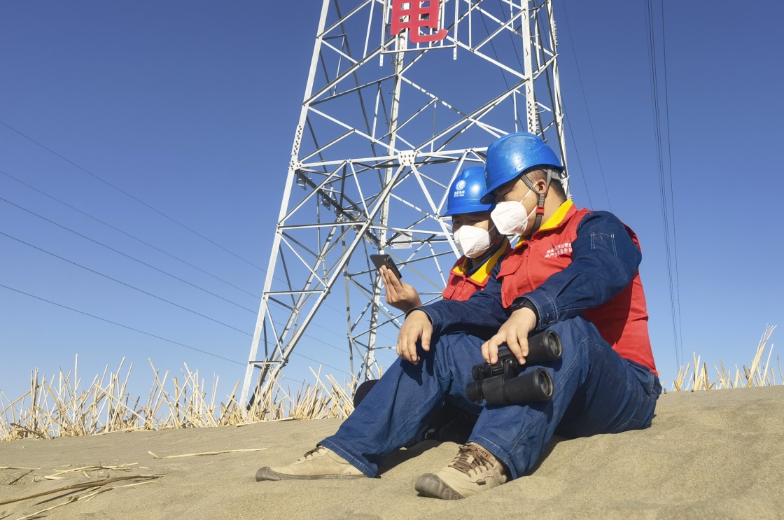 10月16日,在塔克拉瑪干沙漠中,新疆和田供電公司保電人員在巡視110千伏輸電線路途中,通過手機(jī)收看中國(guó)共產(chǎn)黨第二十次全國(guó)代表大會(huì)開幕會(huì)。