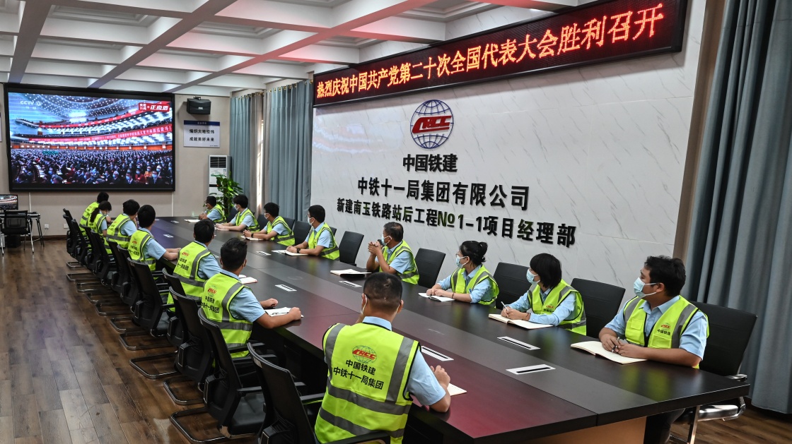 10月16日,廣西南玉鐵路玉林北站項(xiàng)目建設(shè)者在收看中國(guó)共產(chǎn)黨第二十次全國(guó)代表大會(huì)開幕會(huì)。