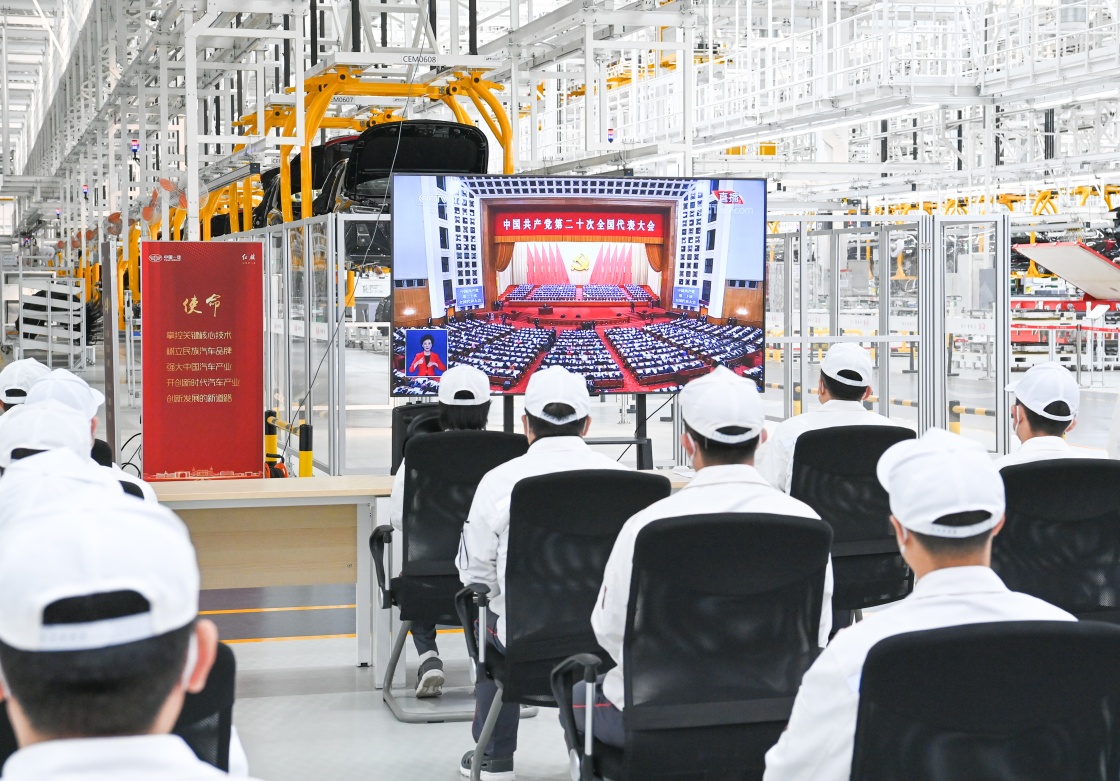 10月16日,在吉林省長(zhǎng)春市中國(guó)第一汽車集團(tuán)有限公司紅旗繁榮工廠,職工在收看中國(guó)共產(chǎn)黨第二十次全國(guó)代表大會(huì)開幕會(huì)。