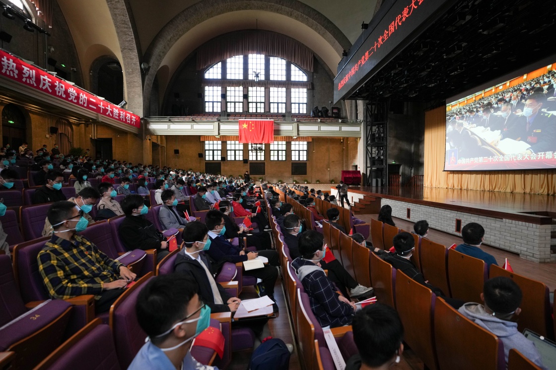 10月16日,在清華大學(xué)大禮堂,清華大學(xué)師生在收看中國(guó)共產(chǎn)黨第二十次全國(guó)代表大會(huì)開幕會(huì)。