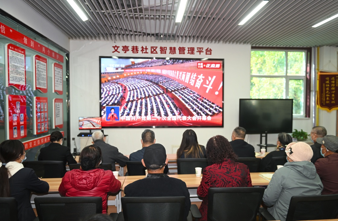 10月16日,在青海省西寧市城西區(qū)文亭巷社區(qū)黨群服務(wù)中心,居民在收看中國(guó)共產(chǎn)黨第二十次全國(guó)代表大會(huì)開幕會(huì)。
