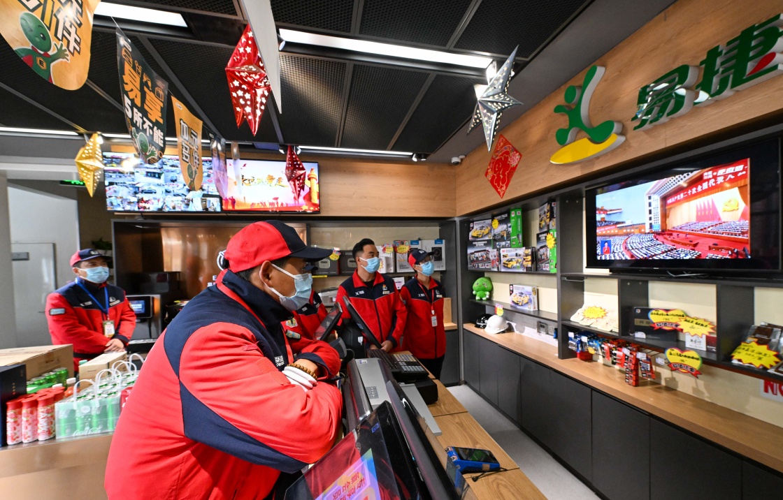 10月16日,在位于天津市南開區(qū)的中國(guó)石化銷售股份有限公司天津石油分公司長(zhǎng)江道加油站,工作人員在工作間隙觀看開幕會(huì)直播。