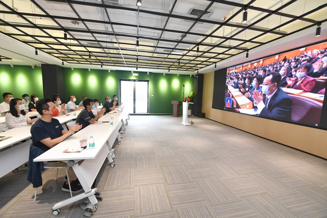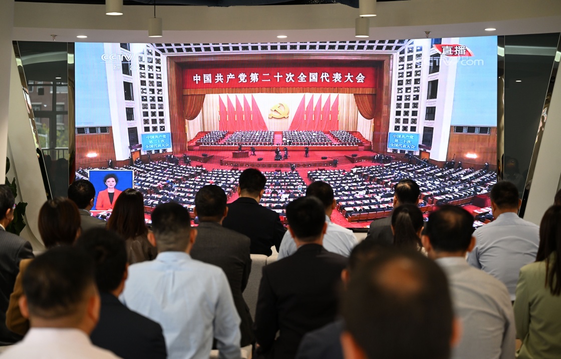 10月16日,在廣東省深圳市前海深港青年夢(mèng)工場(chǎng)北區(qū),在前海工作的青年收看中國(guó)共產(chǎn)黨第二十次全國(guó)代表大會(huì)開幕會(huì)。