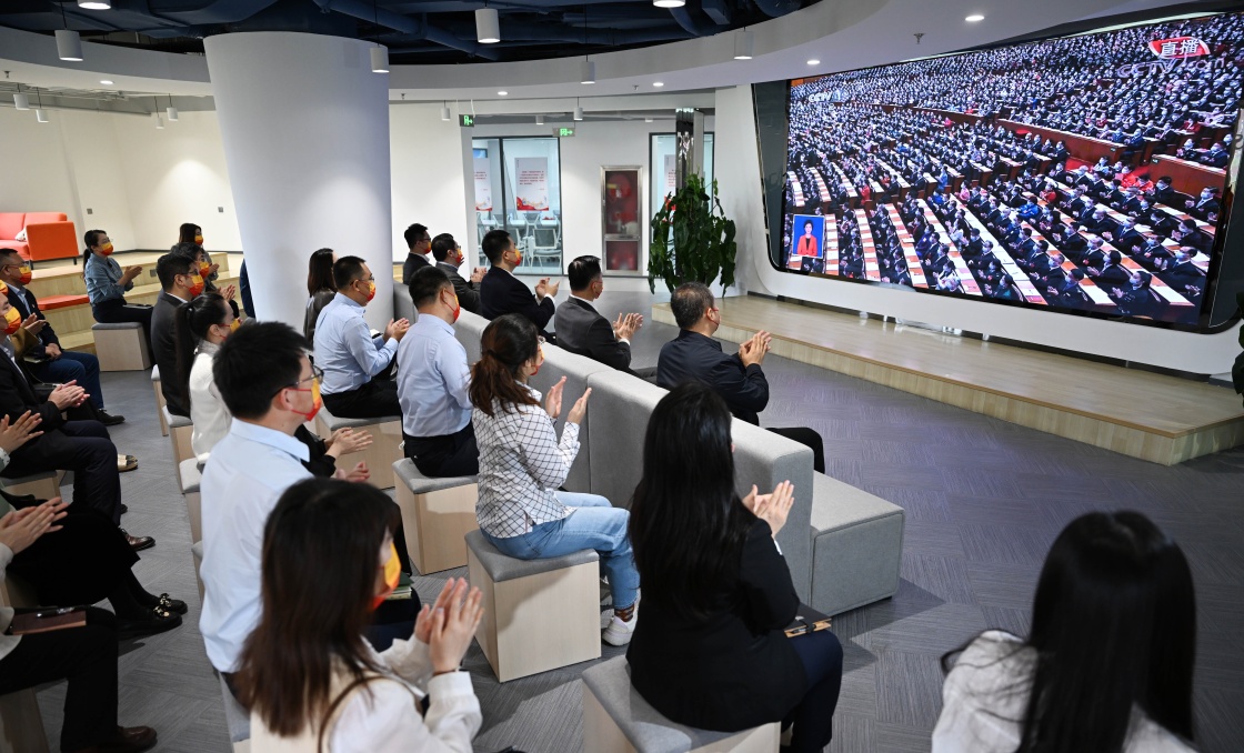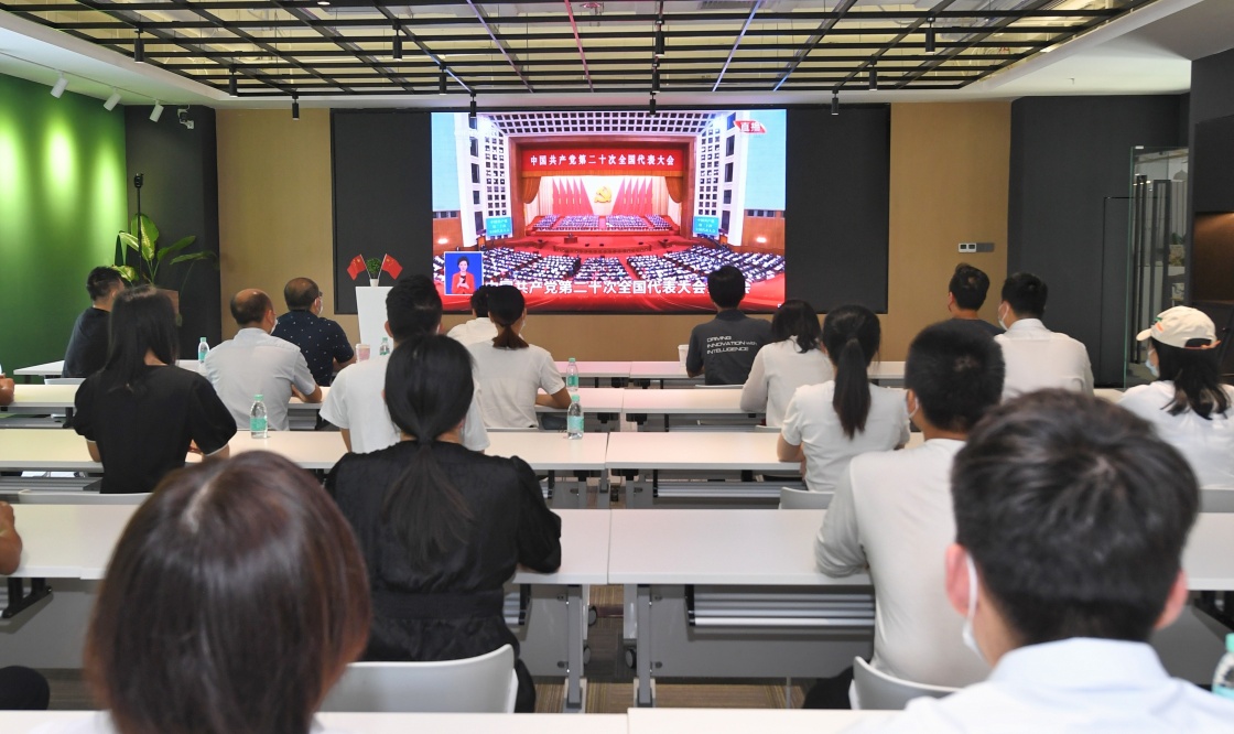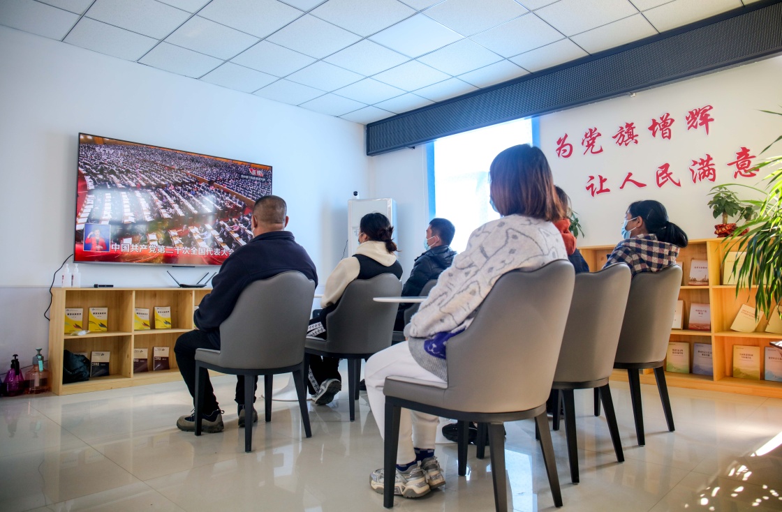 10月16日,在天津市濱海新區(qū)濱海-中關(guān)村科技園,企業(yè)員工在收看中國(guó)共產(chǎn)黨第二十次全國(guó)代表大會(huì)開幕會(huì)。