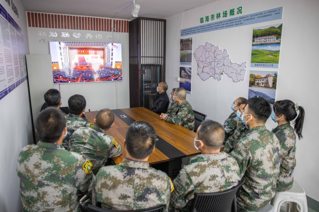 10月16日,浙江省臺(tái)州臨海市林場(chǎng)職工在位于括蒼山的林場(chǎng)內(nèi)收看中國(guó)共產(chǎn)黨第二十次全國(guó)代表大會(huì)開幕會(huì)。