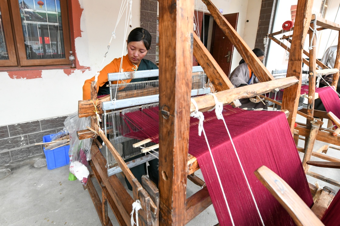 10月16日,在四川阿壩汶川縣映秀鎮(zhèn)漁子溪村,織工在紡織牦牛絨披肩。新華社記者 唐文豪 攝