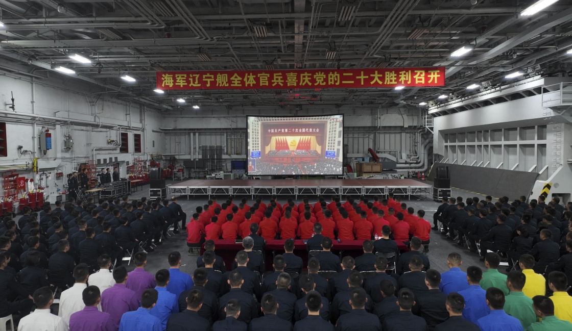 10月16日,遼寧艦全體官兵收看中國共產黨第二十次全國代表大會開幕會。新華社發(fā)(任澤霖 攝)
