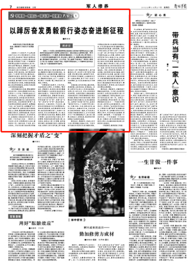 黨的二十大報(bào)告,是黨團(tuán)結(jié)帶領(lǐng)全國各族人民奪取中國特色社會主義新勝利的政治宣言和行動綱領(lǐng),是我們黨又一篇馬克思主義綱領(lǐng)性文獻(xiàn)。學(xué)習(xí)宣傳貫徹黨的二十大精神,就要緊緊圍繞黨的二十大主題,深入學(xué)習(xí)黨的二十大報(bào)告和黨章等重要文件,學(xué)出信心、增強(qiáng)斗志,凝聚起奮進(jìn)新征程的力量,勇?lián)聲r(shí)代使命任務(wù)。從今天起,“軍人修養(yǎng)”專版推出“‘學(xué)報(bào)告·增信心·強(qiáng)斗志·擔(dān)使命’大家談”專欄,刊登學(xué)習(xí)貫徹黨的二十大精神的系列體會文章,為廣大讀者提供學(xué)習(xí)參考。