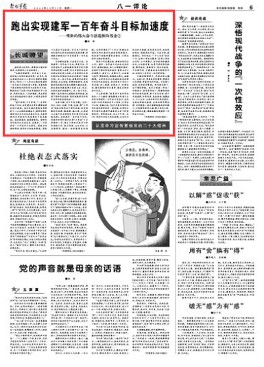 “如期實現(xiàn)建軍一百年奮斗目標,加快把人民軍隊建成世界一流軍隊,是全面建設社會主義現(xiàn)代化國家的戰(zhàn)略要求?!秉h的二十大作出如期實現(xiàn)建軍一百年奮斗目標的重大部署,豐富拓展了黨在新時代的強軍目標的時代內(nèi)涵,鮮明標定了未來5年我軍建設的中心任務,是黨的意志、人民的期盼,是全軍官兵必須扛起的時代重任、必須交出的歷史答卷。
