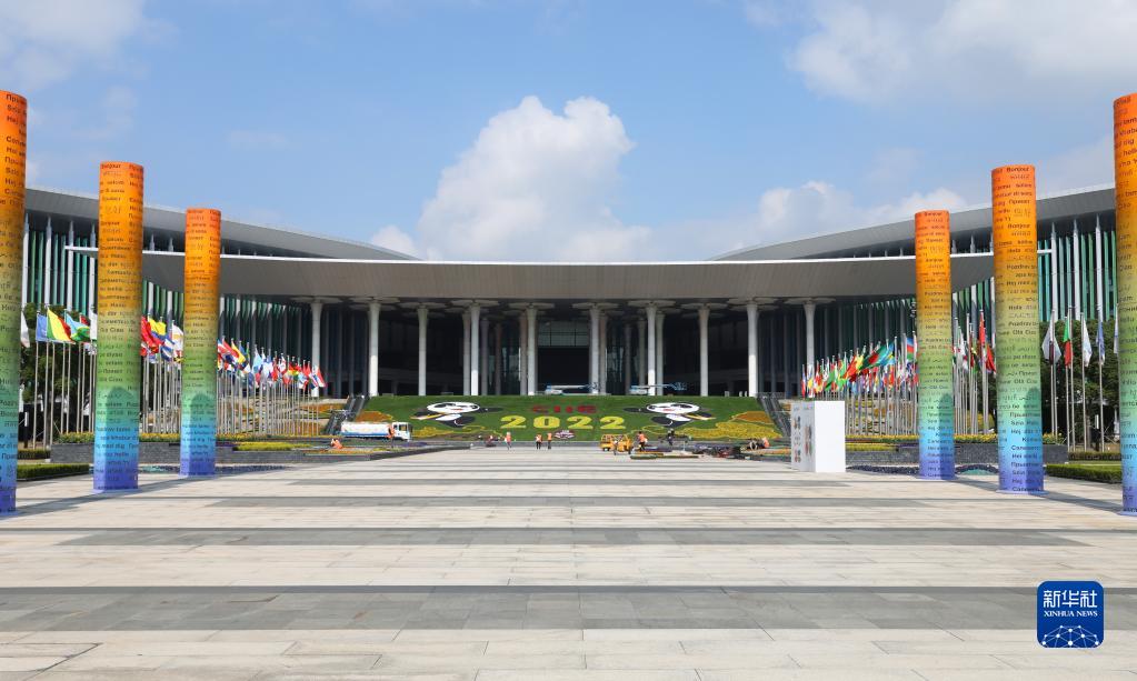 10月15日,在國家會展中心(上海)南廣場,園藝工人在進(jìn)行鮮花裝飾工作。