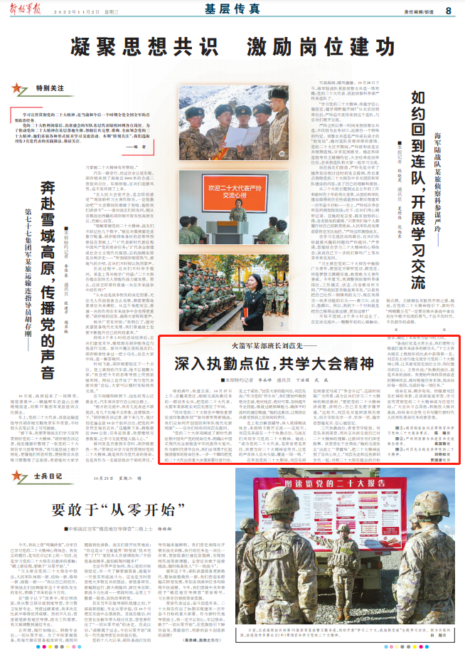 在參加黨的二十大期間,劉苡先將見聞感受寫成了“參會日記”,這段時間被廣為傳看,成為官兵們學(xué)習(xí)二十大精神的鮮活教材?!耙腰h的二十大精神講清楚、講明白,自己首先要學(xué)懂弄通。”這些天,劉苡先反復(fù)研讀報告原文,結(jié)合實(shí)際先學(xué)一步、學(xué)深一層,越學(xué)思想越充實(shí)、信心越堅定。