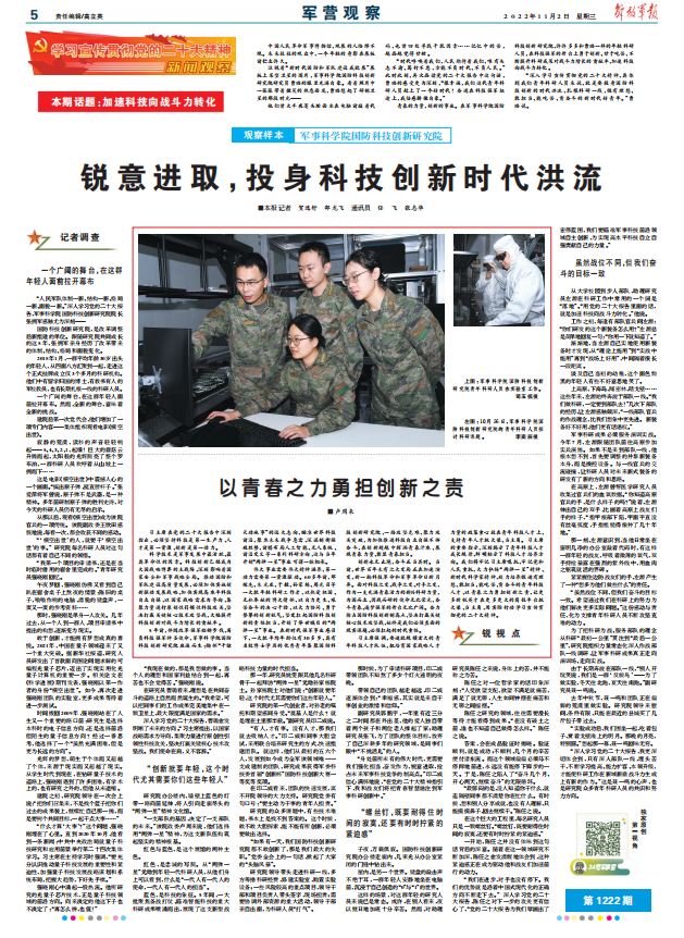 青春的力量,創(chuàng)新的事業(yè)。在軍事科學院國防科技創(chuàng)新研究院,許許多多和曹璐一樣的年輕科研人員,在科技強軍的舞臺上勇于創(chuàng)新、甘于吃苦,不斷提升科研成果對戰(zhàn)斗力增長的貢獻率,加速科技向戰(zhàn)斗力轉化。