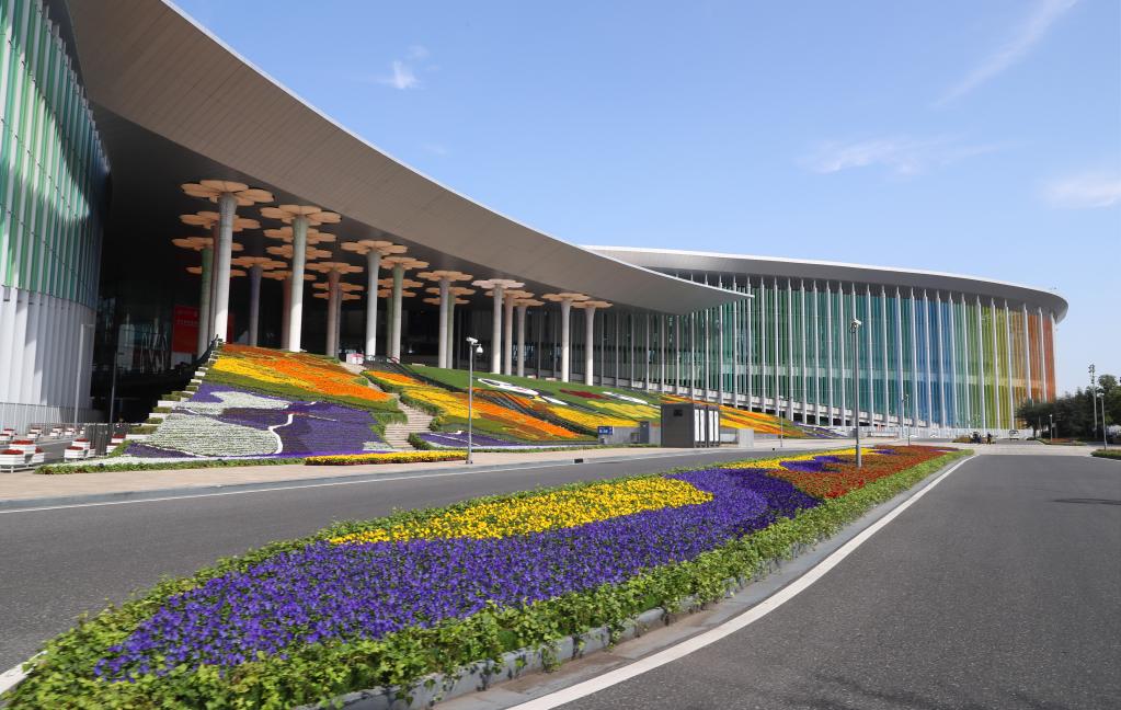 國家會展中心(上海)場館外部進博會主題裝飾工程進入收尾階段。新華社記者 方喆 攝