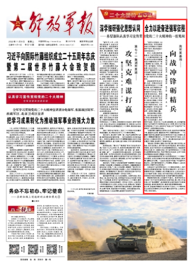 “要發(fā)揚斗爭精神,增強斗爭本領(lǐng),著力提升防風(fēng)險、迎挑戰(zhàn)、抗打壓的能力,勇于面對各種風(fēng)險挑戰(zhàn),勇于克服各種困難,堅定不移把黨中央決策部署落到實處?!痹摶仡I(lǐng)導(dǎo)告訴記者,對一線部隊來說,學(xué)習(xí)宣傳貫徹黨的二十大精神,就要賡續(xù)因戰(zhàn)而生、向戰(zhàn)沖鋒的紅色血脈,讓學(xué)習(xí)實踐活動圍繞練兵備戰(zhàn)抓、跟著戰(zhàn)斗任務(wù)走。