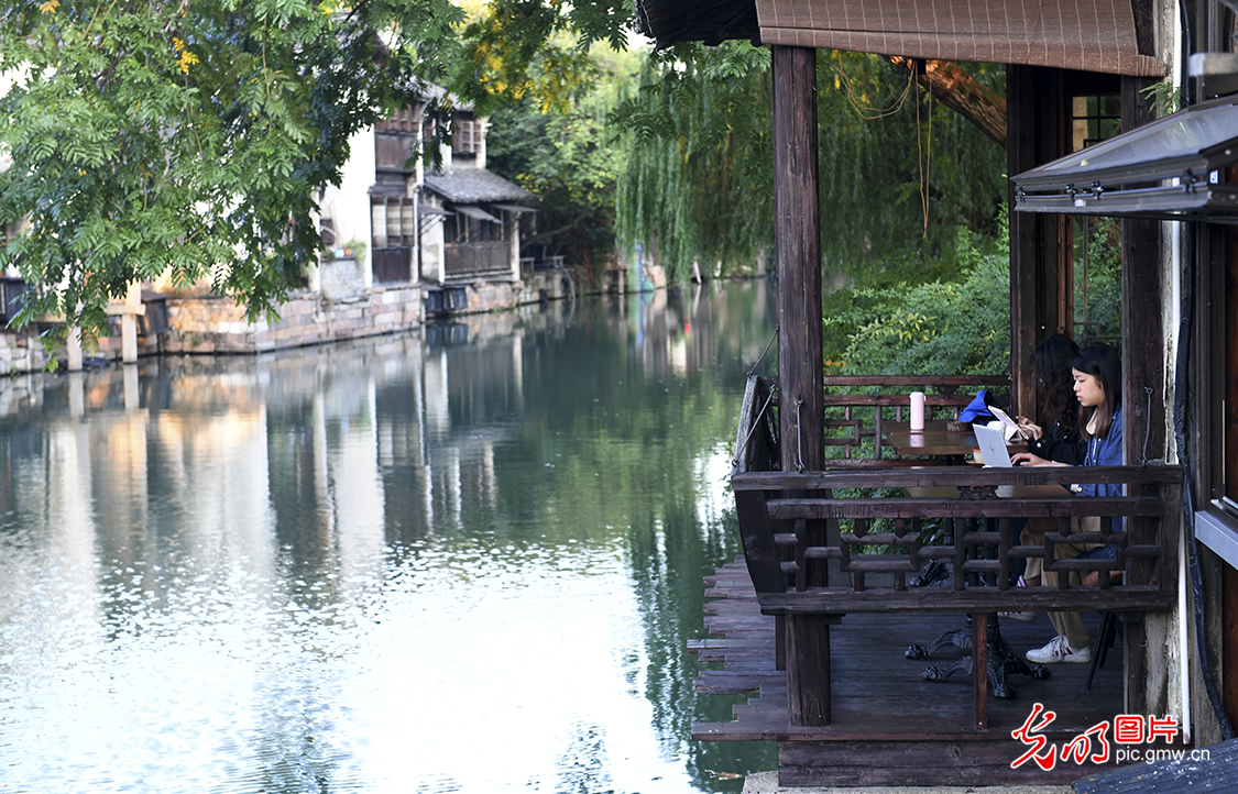 2022年11月6日,兩名媒體記者在烏鎮(zhèn)西柵景區(qū)一家咖啡廳工作。(光明網(wǎng)記者 潘迪攝/光明圖片)