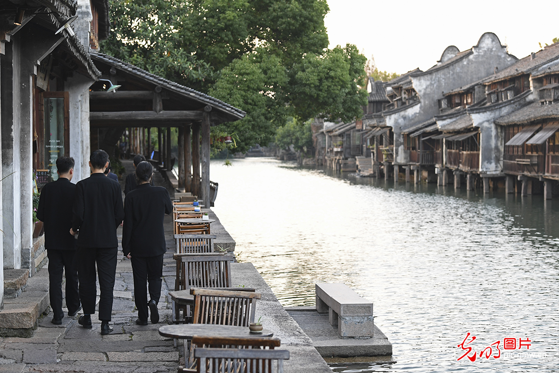 2022年11月6日,幾名工作人員走在烏鎮(zhèn)西柵景區(qū)。(光明網(wǎng)記者 潘迪攝/光明圖片)