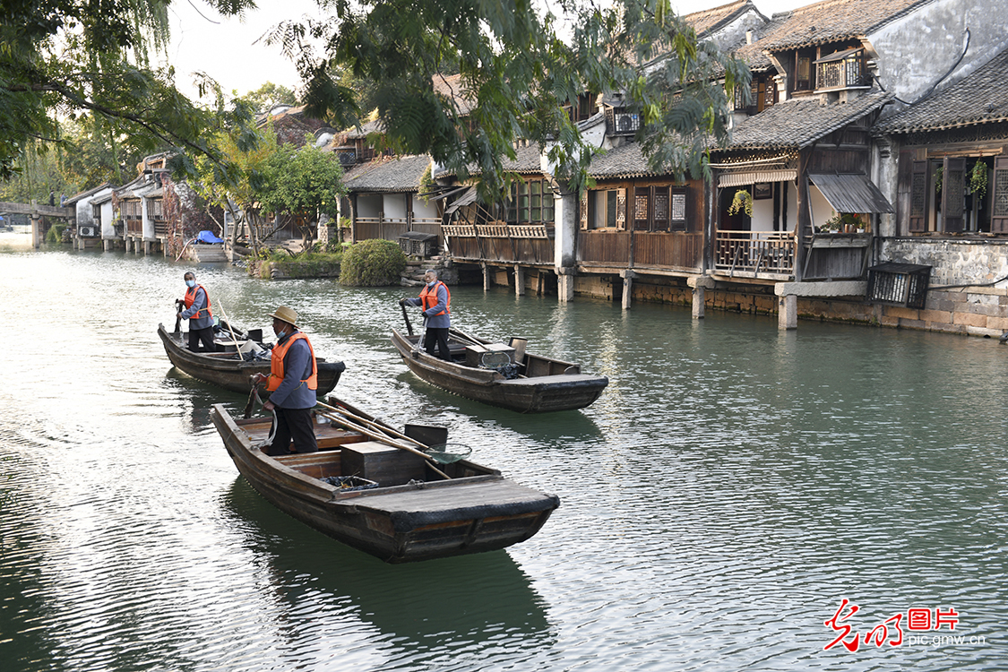 2022年11月6日,烏鎮(zhèn)西柵景區(qū),三名工作人員駕船從水上經(jīng)過。(光明網(wǎng)記者 潘迪攝/光明圖片)