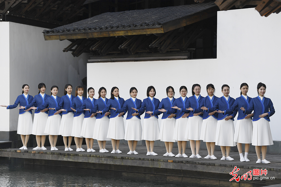 2022年11月6日,烏鎮(zhèn)互聯(lián)網(wǎng)國際會(huì)展中心,“小梧桐”志愿者拍攝合影。(光明網(wǎng)記者 潘迪攝/光明圖片)