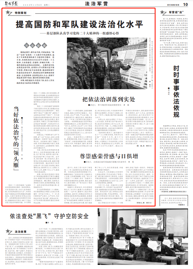 學(xué)習(xí)宣傳貫徹黨的二十大精神,我們要把聚焦點和著力點放在實現(xiàn)建軍一百年奮斗目標(biāo)上。下一步,我們要更加嚴(yán)以律己、從嚴(yán)治軍,當(dāng)好依法治軍的“領(lǐng)頭雁”,把依法治軍、從嚴(yán)治軍要求落到部隊建設(shè)各領(lǐng)域和全過程。