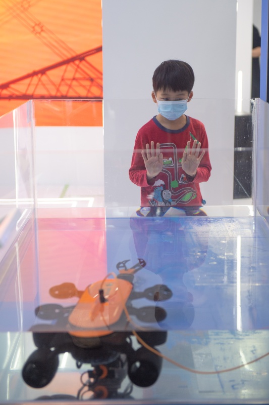 11月8日,小朋友在國家電網(wǎng)展臺參觀水下機(jī)器人。