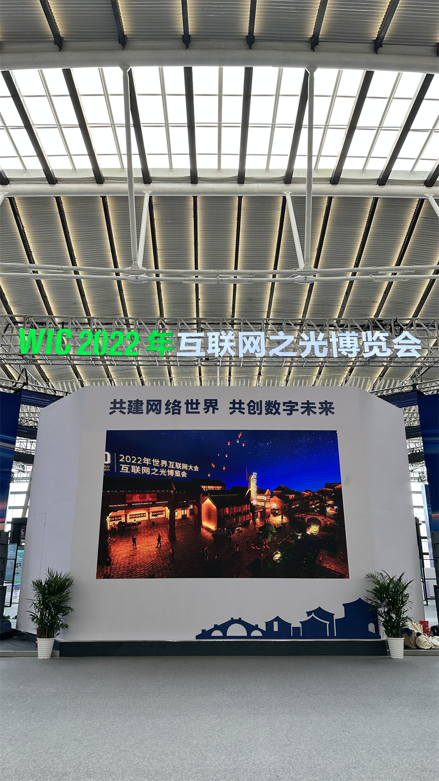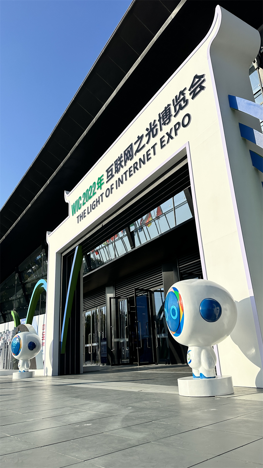 2022年互聯(lián)網(wǎng)之光博覽會(huì)場館外,兩側(cè)是本次烏鎮(zhèn)峰會(huì)全新亮相的世界互聯(lián)網(wǎng)大會(huì)互聯(lián)網(wǎng)之光博覽會(huì)吉祥物“小互”。新華網(wǎng)馬江 攝