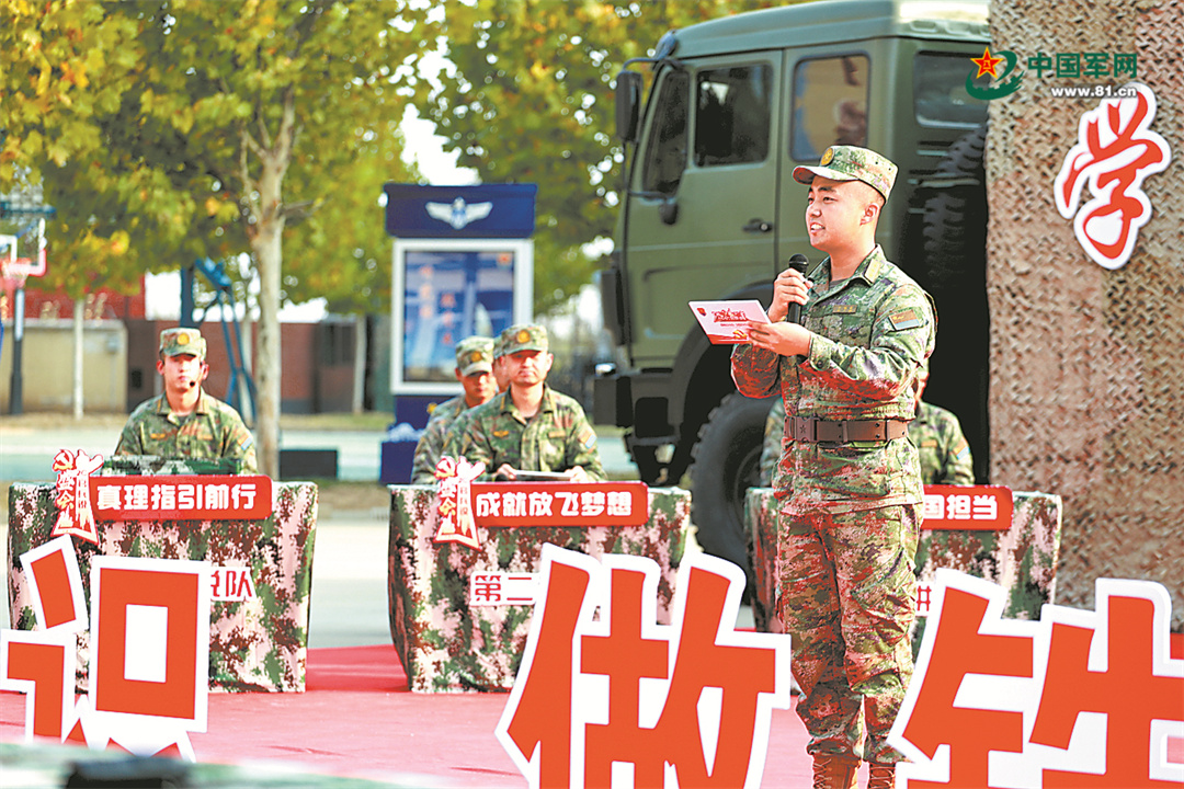 空軍地導(dǎo)某部創(chuàng)新形式開(kāi)展教育活動(dòng),官兵結(jié)合親身經(jīng)歷講述學(xué)習(xí)二十大報(bào)告的感悟。李衛(wèi)民攝