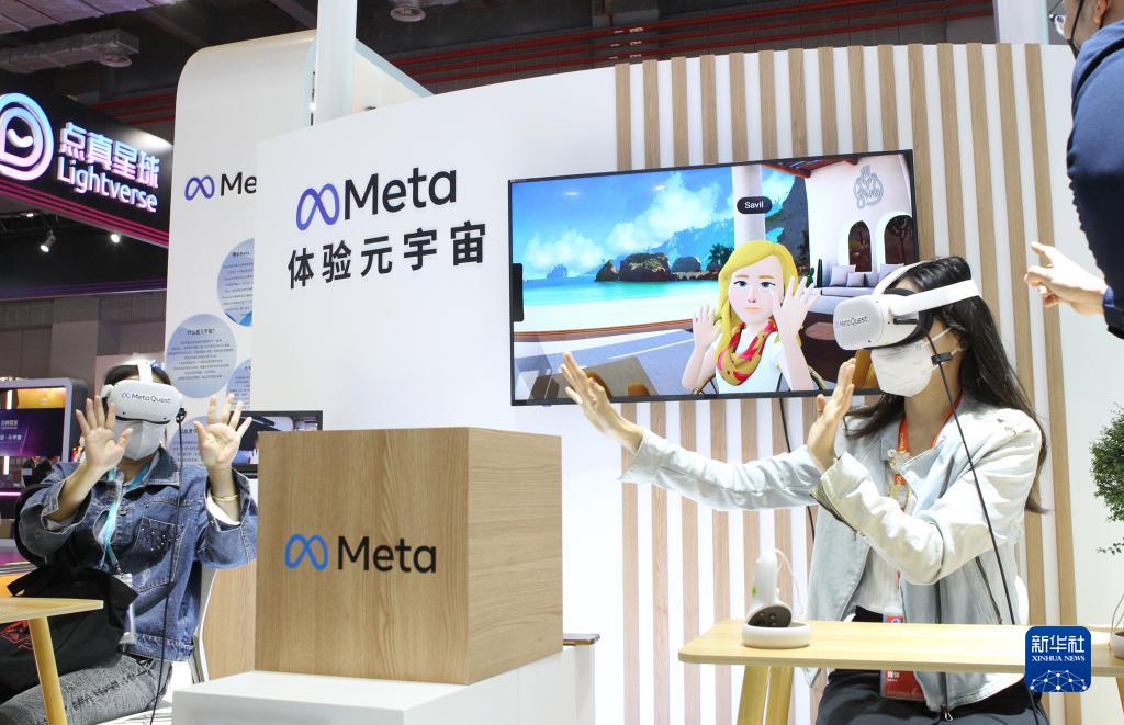 2022年11月7日,在第五屆進(jìn)博會(huì)技術(shù)裝備展區(qū)的人工智能專區(qū),體驗(yàn)者借助VR頭戴設(shè)備感受在虛擬工作空間“隔空擊掌”。新華社記者 侯俊 攝