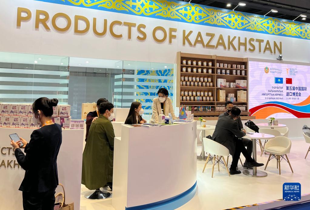 這是2022年11月6日在第五屆進(jìn)博會(huì)上拍攝的哈薩克斯坦產(chǎn)品展區(qū)。新華社記者 鄭冬睿 攝