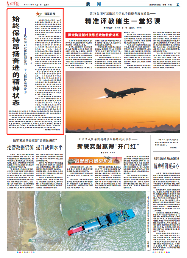 新征程是充滿光榮和夢想的遠征。黨的二十大報告描繪了如期實現(xiàn)建軍一百年奮斗目標、加快把人民軍隊建成世界一流軍隊的發(fā)展藍圖,豐富拓展了黨在新時代的強軍目標的時代內(nèi)涵,鮮明標定了未來5年我軍建設的中心任務。藍圖已經(jīng)繪就,號角已經(jīng)吹響。我們應錨定目標、踔厲奮發(fā)、勠力同心、篤行不怠,勇于戰(zhàn)勝前進路上的“攔路虎”“絆腳石”,敢于跨越強軍途中的“婁山關”“臘子口”,心往一處想、勁往一處使,跑出加速度、奪取新勝利,確保如期實現(xiàn)建軍一百年奮斗目標。
