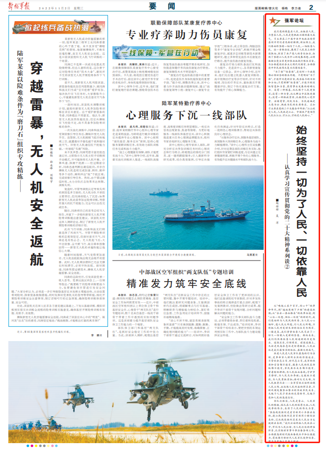 軍隊打勝仗,人民是靠山。人民軍隊的根脈,深扎在人民的深厚大地;人民戰(zhàn)爭的偉力,來源于人民的偉大力量?!盎春?zhàn)役勝利是老百姓用小車推出來的,渡江戰(zhàn)役勝利是老百姓用小船劃出來的,遼沈戰(zhàn)役勝利是東北人民全力支援拼出來的?!蔽覀儜?yīng)始終把人民放在心中,牢記為人民扛槍、為人民打仗的神圣職責(zé),扎實做好軍事斗爭準備各項工作,全面提高新時代練兵備戰(zhàn)水平和打贏能力,有效履行新時代人民軍隊使命任務(wù),努力為黨和人民再立新功。