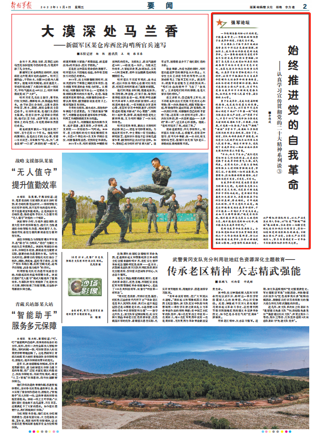 黨的自我革命永遠(yuǎn)在路上。全軍各級黨組織必須堅(jiān)決貫徹落實(shí)黨的二十大作出的決策部署,持之以恒地推進(jìn)自我革命,堅(jiān)持以理論武裝凝心聚魂,以整飭作風(fēng)激濁揚(yáng)清,以嚴(yán)明紀(jì)律強(qiáng)化約束,以從嚴(yán)治吏匡正用人導(dǎo)向,以“打虎”“拍蠅”“獵狐”懲治腐敗,堅(jiān)決清除一切損害黨的先進(jìn)性和純潔性的因素,清除一切侵蝕黨的健康肌體的病毒,不斷把全面從嚴(yán)治黨、全面從嚴(yán)治軍引向深入,努力為實(shí)現(xiàn)建軍一百年奮斗目標(biāo)提供紀(jì)律和作風(fēng)支撐。