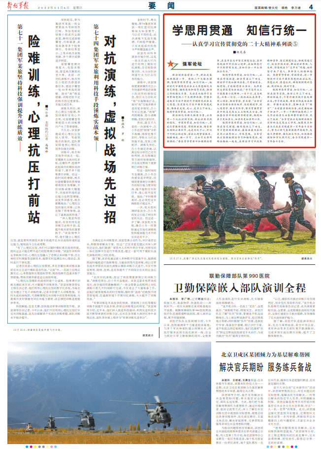 理論創(chuàng)新每前進(jìn)一步,理論武裝就要跟進(jìn)一步。黨的二十大報(bào)告強(qiáng)調(diào),堅(jiān)持學(xué)思用貫通、知信行統(tǒng)一,把新時(shí)代中國特色社會(huì)主義思想轉(zhuǎn)化為堅(jiān)定理想、錘煉黨性和指導(dǎo)實(shí)踐、推動(dòng)工作的強(qiáng)大力量。無論是興起學(xué)習(xí)宣傳貫徹黨的二十大精神熱潮、學(xué)懂弄通做實(shí)習(xí)近平新時(shí)代中國特色社會(huì)主義思想,還是深化習(xí)近平強(qiáng)軍思想武裝,都要在走深、走心、走實(shí)上下功夫,做到學(xué)思用貫通、知信行統(tǒng)一。