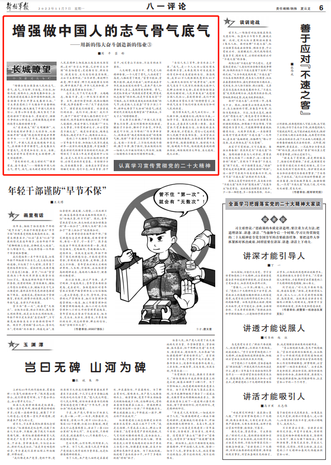 人無剛骨,安身不牢。骨氣是人的精神脊梁,一個人有了骨氣,人品就有了高度,人格就有了硬度。“富貴不能淫,貧賤不能移,威武不能屈”,這種流淌在中華民族血液深處的骨氣,在共產(chǎn)黨人和革命軍人身上,表現(xiàn)得更為鮮明。骨氣,就是紅軍戰(zhàn)士“風(fēng)雨侵衣骨更硬,野菜充饑志越堅”的樂觀;就是作家朱自清“寧可餓死,也不領(lǐng)取美國發(fā)放的救濟糧”的氣節(jié);就是鐵人王進喜“寧肯少活二十年,拼命也要拿下大油田”的豪氣;就是新時代衛(wèi)國戍邊英雄官兵“寧灑熱血,不失寸土”的錚錚鐵骨。