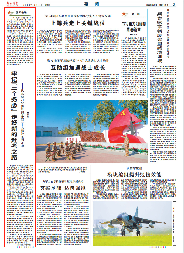 不忘初心、牢記使命是黨的性質(zhì)宗旨、理想信念、奮斗目標的集中體現(xiàn)。百年征程波瀾壯闊,百年初心歷久彌堅。中國共產(chǎn)黨一經(jīng)誕生,就把為中國人民謀幸福、為中華民族謀復興確立為自己的初心使命。前進道路上,我們應牢記中國共產(chǎn)黨是什么、要干什么這個根本問題,將初心融進靈魂,把使命扛在肩上,錨定建軍一百年奮斗目標,踔厲奮發(fā)、勇毅前行,有效履行新時代軍隊使命任務,始終做黨和人民完全可以信賴的英雄軍隊。